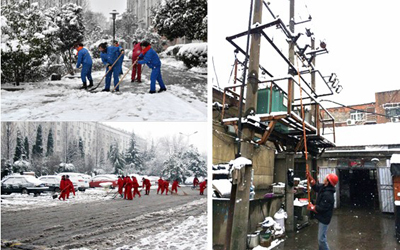 東華集團(tuán)所屬物業(yè)服務(wù)單位立即啟動(dòng)大雪天氣應(yīng)急預(yù)案,組織工作人員提前上崗,不分工種、崗位,迎著風(fēng)雪,冒著嚴(yán)寒清除小區(qū)路面、工廣道路中的積雪。同時(shí),在醒目位置放置或張貼防滑安全警示,提醒業(yè)主注意安全,在特別濕滑的路面鋪上防滑墊,避免業(yè)主滑倒。