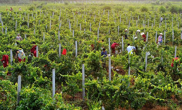 炎炎夏日正是葡萄成熟的季節(jié)。位于瓦蚌湖畔的東華農(nóng)莊,串串成熟的葡萄掩映在密密匝匝的綠色之中。清晨,帶著露珠的葉子像是被牛乳洗過(guò)的一樣,遠(yuǎn)遠(yuǎn)望去整個(gè)葡萄園就是一片綠海,而綠海中竟然點(diǎn)綴著點(diǎn)點(diǎn)的“東華紅”——那是身著工作服的機(jī)關(guān)人員在采摘葡萄,初升的太陽(yáng)毫不吝嗇的撒下一片金光,好一幅凝住的油畫(huà)!