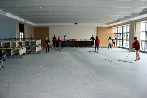 這次的保潔工作與任何一次都不同,在不具備條件的情況下就進行保潔工作。工作過程中我們面臨著極大地困難:大廈施工尚未結(jié)束,有幾個施工單位同時施工,每當(dāng)完成一遍保潔工作時,十幾分鐘后施工單位又會產(chǎn)生垃圾,這給保潔工作帶來了極大地難度。高溫天氣下,大廈內(nèi)成土飛揚,工作環(huán)境較為惡劣,況且我們每天都需要對整個大廈的重新保潔,高強度的勞動造成了保潔人員隊伍的極不穩(wěn)定。
