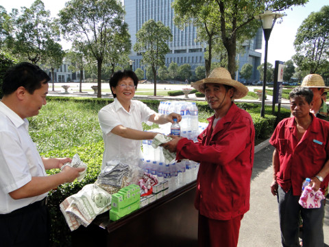 對于常年高溫的洗衣機房,針對蒸汽管溫度過高問題,該隊男職工找來隔熱材料,將其包裹,有效降低了室內(nèi)溫度;對于新接手的車房,針對值班室在車房外且無任何降溫設施的情況,項目部領導向礦方爭取了空調(diào),第一時間安裝到位;對于奮戰(zhàn)在工廣路的清潔工,領導們?yōu)樗麄兯腿チ朔朗罱禍氐乃幤泛褪称,并一再叮囑大家要輪流作業(yè),適當休息,如有不適要立即停下工作或報告班隊長。同時,做好內(nèi)部穩(wěn)定工作,營造團結(jié)和諧的工作氛圍,保障職工平安度夏。