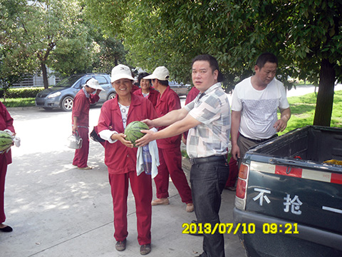 7月10日上午,氣溫達到38度高溫,潘北項目部領(lǐng)導為了體現(xiàn)關(guān)心職工,確保安全,嚴防職工高溫中暑現(xiàn)象的發(fā)生,自籌部分資金,積極開展了“送清涼”活動,購買了西瓜、熬制了綠豆茶為工作在一線的職工送去一絲清涼。