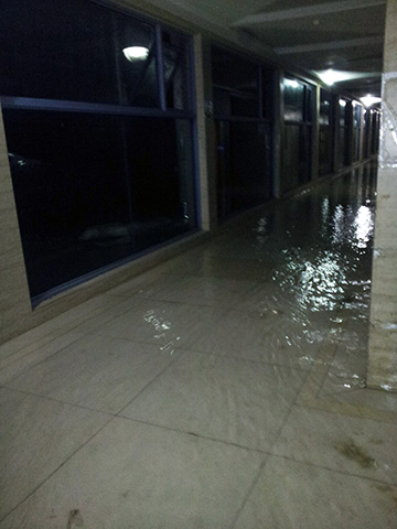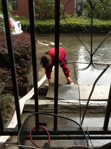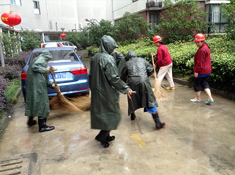 洞泉處立即啟動應(yīng)急預(yù)案,24日凌晨1:40分小區(qū)所有工作人員趕到現(xiàn)場全力進行搶險。這時小區(qū)所有地段積水已達十幾厘米深,尤其是A、B、C座公寓樓積水更為嚴(yán)重,因為這里有電梯,一旦水漫電梯,就會造成電梯損壞,帶來安全事故。事情緊急,大家兵分兩路,對電梯進行仔細查看和對小區(qū)所有地段進行緊急排水。在檢查電梯時,看到積水正在涌進電梯底部,工作人員立刻把電梯停在五樓,拿來小抽水泵對電梯底部進行抽排。與此同時,另一路人馬在小區(qū)辦主任的帶領(lǐng)下,采取用大掃帚掃、桶拎等方式對積水進行排除。九月底的夜晚,驟然變冷的天氣,狂風(fēng)夾雜著暴雨…….大家全然不顧惡劣的天氣,經(jīng)過一夜的緊張忙碌,早上7點左右,電梯坑及路面積水全部排除,確保了公共財產(chǎn)安全。