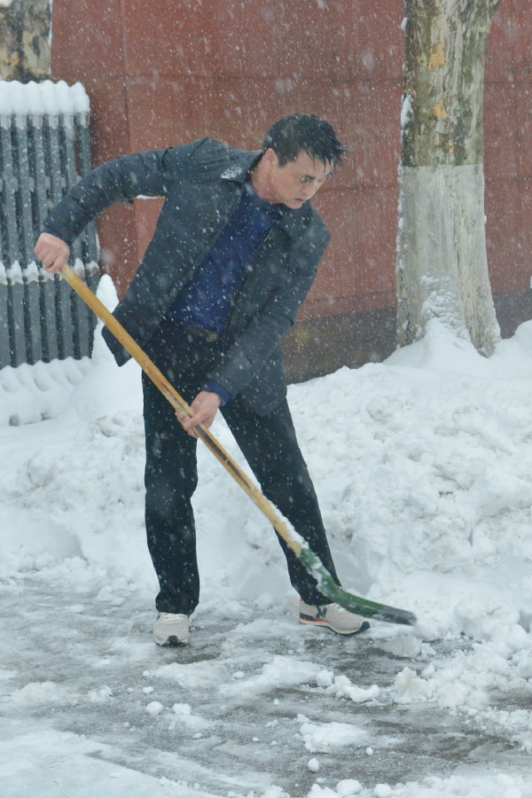 在文明村,集團(tuán)公司總經(jīng)理雷鳴帶領(lǐng)另一組機(jī)關(guān)工作人員對(duì)主干道及樓道小路積雪進(jìn)行清除。身處嚴(yán)寒,大家卻汗流浹背。