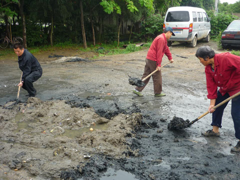 5月29日清晨,人民村業(yè)主驚愕的發(fā)現(xiàn),出村必行的南北主路上不知被什么車輛斷斷續(xù)續(xù)拋灑了近10噸淤泥,拋灑范圍足有100多米長,有的地方淤泥厚達(dá)20多厘米,當(dāng)天正下著大雨,大雨沖著淤泥四處流溢,路上又臟又臭,嚴(yán)重影響200多戶業(yè)主的出行。