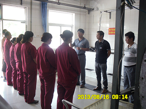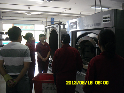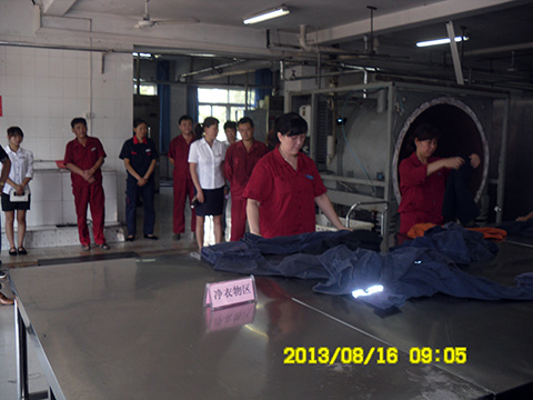 現場學習首先由兩組交接班人員列隊在班長的監(jiān)督下對現場設備設施的安全情況及工作中需注意的事項進行交接,并互囑注意安全;然后洗衣女工為大家演示了收衣、洗衣、烘干、疊衣、上架整個工作流程,手指口述了洗衣、烘干流程,強調了這兩個流程的安全重要性。最后項目部領導對洗衣房提出了創(chuàng)建無止境、揚長避短、精益求精不斷提高服務質量,同時要求其他車間以洗衣房為標桿,認真貫標、執(zhí)標,確保年底全面達標的要求。