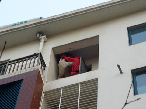 “從來沒見這么高的地方長馬蜂窩,還長這么大,像口大鍋一樣!”桃原居小區(qū)辦工作人員驚訝的說。該小區(qū)主任立刻向處里匯報,并拔打119報警,119消防員到現(xiàn)場后,小區(qū)辦按其要求購買了滅蟲藥物,并為其打開六樓空置房房門。消防員隨即著紅色防護(hù)服和殺蟲劑等工具上窗臺對馬蜂窩進(jìn)行清理,在清理過程中,不少馬蜂狼狽逃竄,在12號樓附近飛舞。為了保證業(yè)主安全,小區(qū)辦工作人員站在12號樓前后,指引進(jìn)出業(yè)主繞道通行,避免發(fā)生意外。