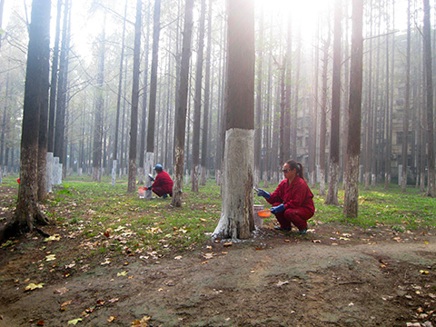 該處從10月下旬開(kāi)始就制定了各種樹(shù)木安全越冬實(shí)施方案,并明確了專(zhuān)人檢查督導(dǎo)。在刷白過(guò)程中,員工們嚴(yán)格按照配劑比例,做到濃度、白度均勻。并給每棵樹(shù)標(biāo)定高度為1米的基準(zhǔn)線,做到止口平整,高度一致,確保整體美觀。此外在給樹(shù)木刷白的同時(shí),各單位還對(duì)綠地內(nèi)樹(shù)木的枯枝、病枝進(jìn)行了修剪,并清理綠化帶內(nèi)的垃圾雜物,保證樹(shù)冠整齊、綠地清潔。