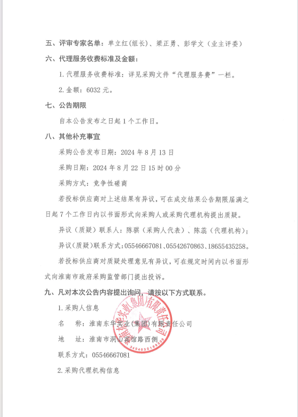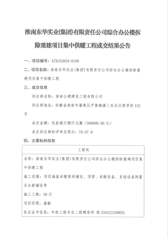 淮南東華實(shí)業(yè)(集團(tuán))有限責(zé)任公司綜合辦公樓拆除重建項(xiàng)目集中供暖工程成交結(jié)果公告